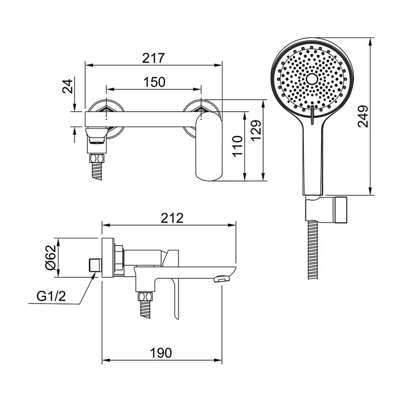 Душевой шланг 150 см, Душевая лейка, Держатель лейки, Комплект отражателей, Комплект эксцентриков
